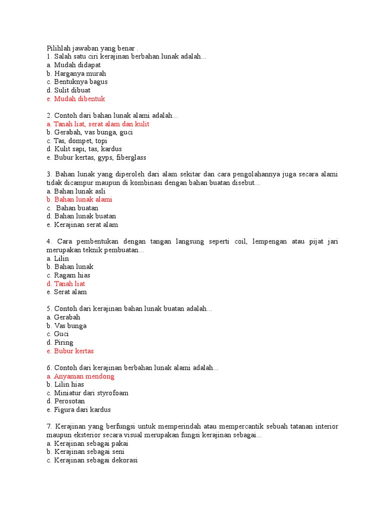 Soal kerajinan bahan lunak #2. See full list on failfaire.org Oct 21, 2020 · soal kerajinan bahan lunak #1. Berikut ini beberapa jenis tanah liat yang harus kamu ketahui : Guci, gerabah, vas bunga, piring. Beberapa di antaranya barang kali sudah sangat populer di tengah masyarakat seperti gerabah, vas bunga, guci, hingga piring. Setelah pembahasan diatas yang mengenai sejarah, jenis dan contoh kerajinan gerabah, mungkin kamu penasaran bagaimana cara membuat dan proses pembuatan gerabah dari tanah liat. Kamu bisa memanfaatkannya sebagai hiasan dirumahmu. Download soal dan kunci jawaban kerajinan bahan lunak. Atau juga setiap bangsa menemukan sendiri cara membuat gerabah tanpa ada unsur peniruan atas bangsa lain. Sebagai bahan bangunan contoh seperti genting, batu bata, dan lainnya semuanya berasal dari tanah liat. Karakteristik tanah liat ini sangat sulit untuk menyerap air, karena mempunyai tekstur tanah yang lengket bila basah dan sangat kuat menyatu dengan tanah lainnya. Ada banyak materi yang nantinya anda pelajari dalam mata pelajaran prakarya yang ada di jenjang sd, smp, sma atau smk.