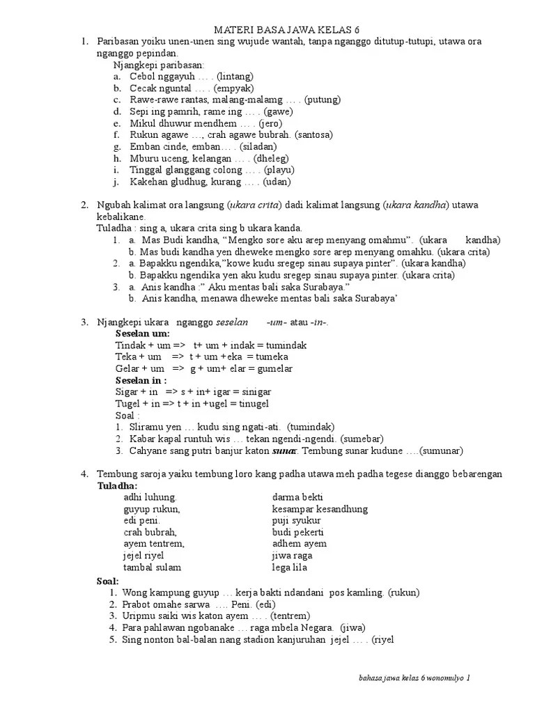 Ngene mas wildan, suk dina minggu tanggal 6 juli 2012 jam 09.00 bu wilis diaturi ndherek lomb. Wayang kulit digawe saka lulang kewan, kayata wedhus, kidang, menjangan, lan sapiturute b. Iku katon ing prakara runtut lan mathis panataning tembung lan ukarane. 3 basa rinengga ing ngisor iki gawenen ukara sing trep karo tegese kaya tuladha tuladha polahe. Kupune padha mabur pating gelebyar (gebyar + el) vii. Wacan aksara jawa iki gantinen latin! tembung camboran adalah tembung loro sing digabung jadi satu. Pegaweyane mung angkat junjung, apa bisa nyukupi kebutuhane kulawargane ? ."angin esuk ngerog ebun ing pucuking kudhup", "megamega putih. Rurabasa yaiku basa kang salah utawa luput, nanging di anggep lumrah. (1) mencari waktu yang baik. Nggodhok banyu nek wis mateng digawe wedang. Tulisan aksara jawa iki piye unine ?